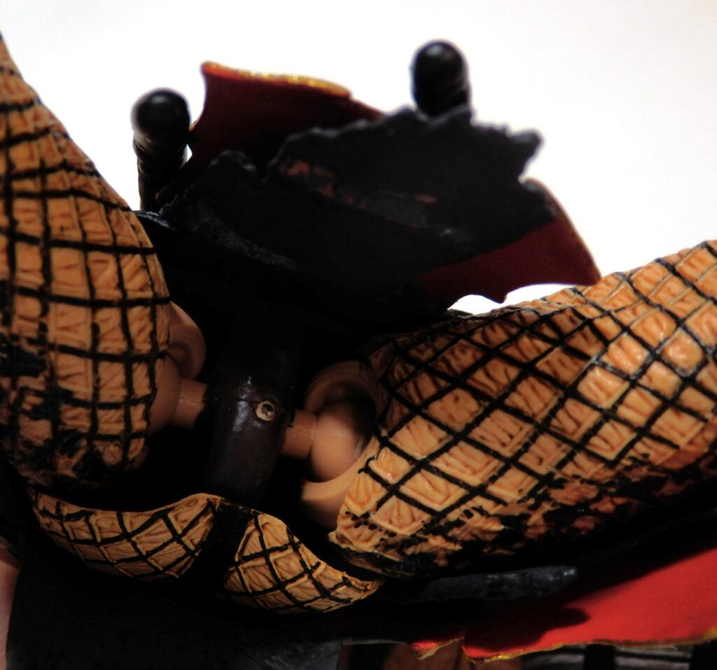 鎧やボロ切れが軟質で曲がるのはもちろんの事、ボロ切れの下に覗く黒いベルト(矢印で示した部分)は胴体のそれと同様、左右のボロ切れには繋がっておらずに下に差し込まれているだけという構造です。