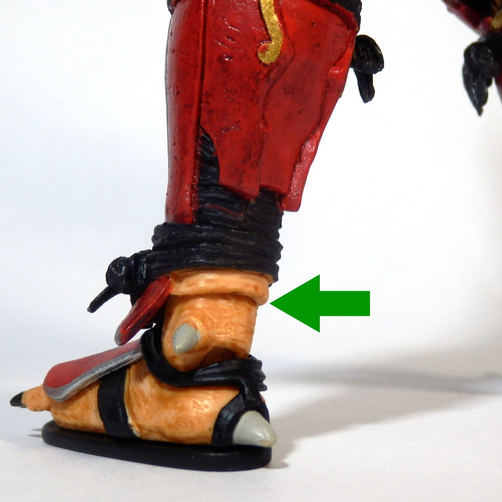 すねの下部の鎧が硬くて曲がらない事を考えると、従来のボールジョイントだけの足首可動の方がサムライには適していたような感があります。