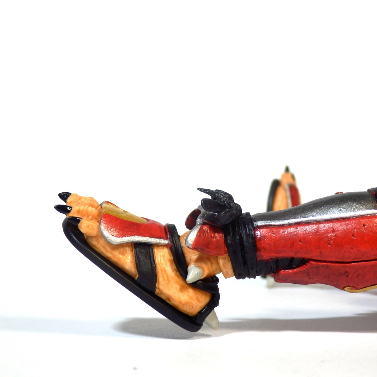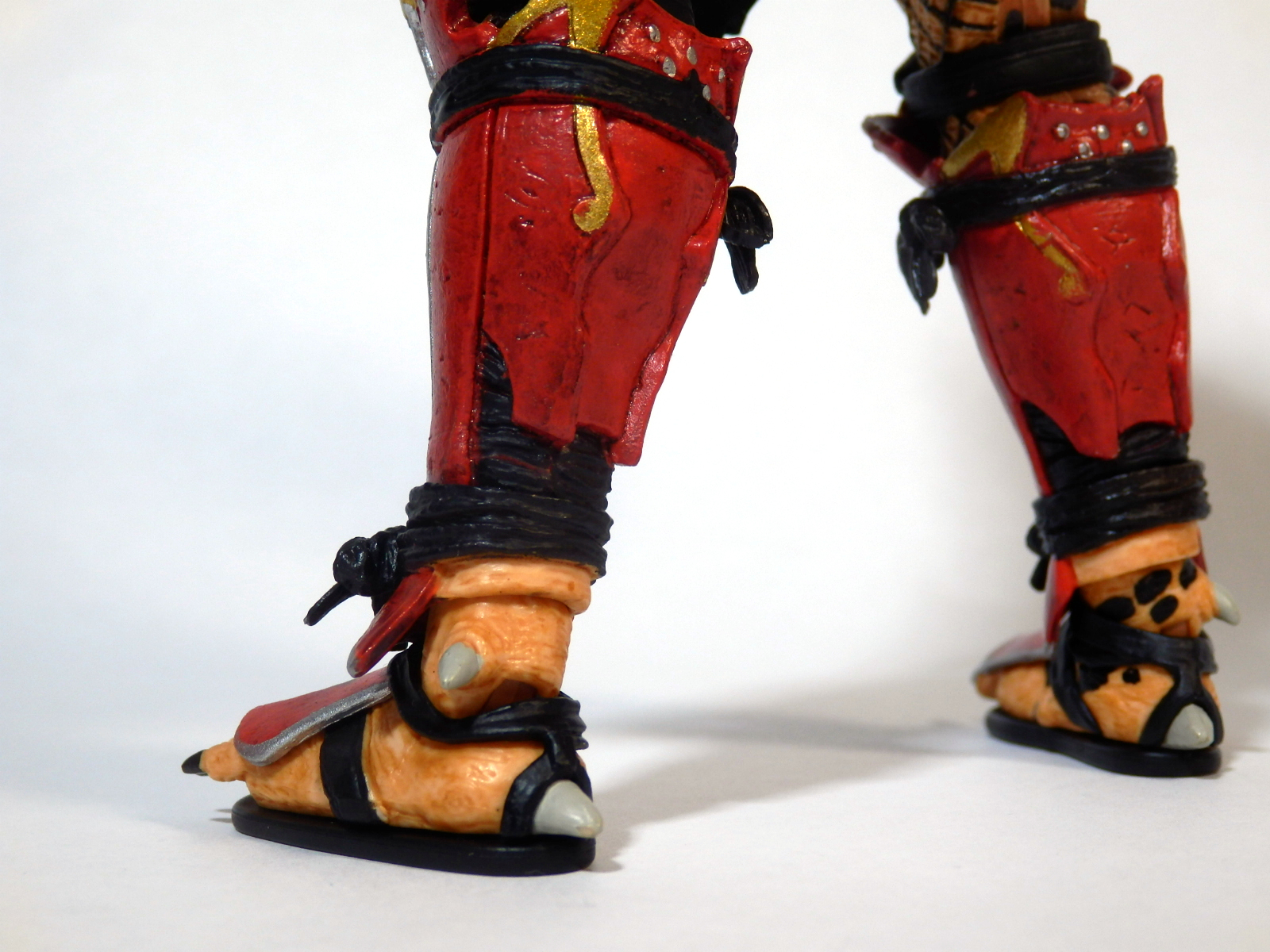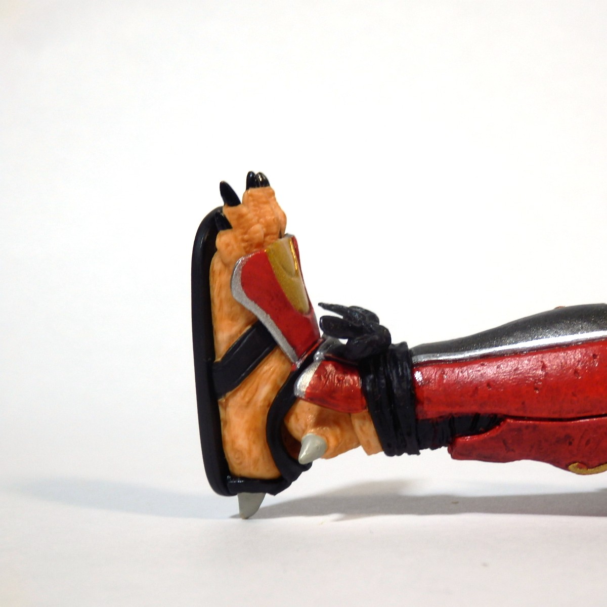 すねの下部の鎧が硬くて曲がらない事を考えると、従来のボールジョイントだけの足首可動の方がサムライには適していたような感があります。